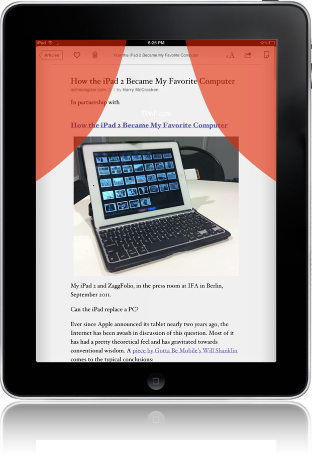 所以,與手機(jī)界面不同,在iPad及同類平板設(shè)備的應(yīng)用當(dāng)中,主要的交互控制對象應(yīng)該被放置在界面的左上角或右上角,以便拇指可以很容易的觸摸到。Instapaper和Twitter在這方面做的都不錯(cuò):