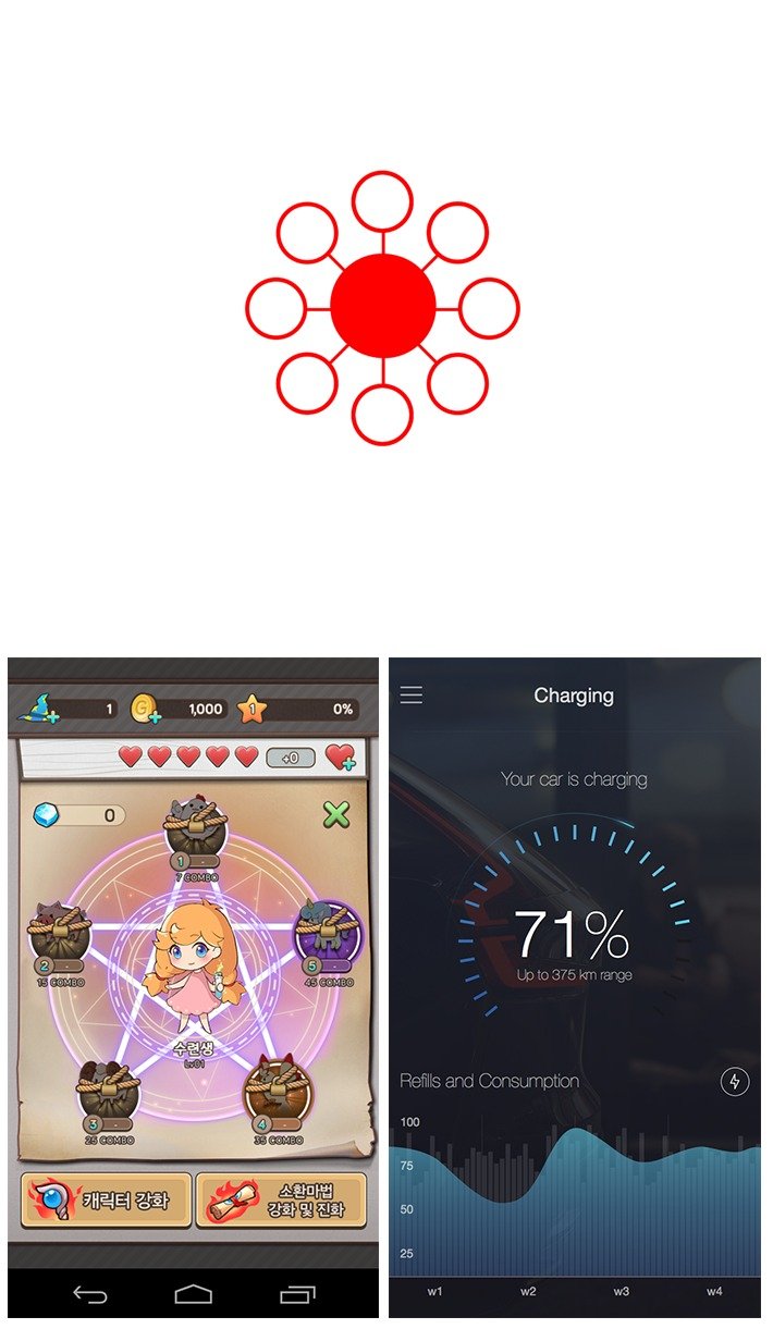 放射形的構(gòu)圖,有凸顯位于中間內(nèi)容或功能點(diǎn)的作用。在強(qiáng)調(diào)核心功能點(diǎn)的時(shí)候,可以試著將功能以圓形的范式排布到中間,以當(dāng)前主要功能點(diǎn)為中心,將其他的按鈕或內(nèi)容放射編排起來。