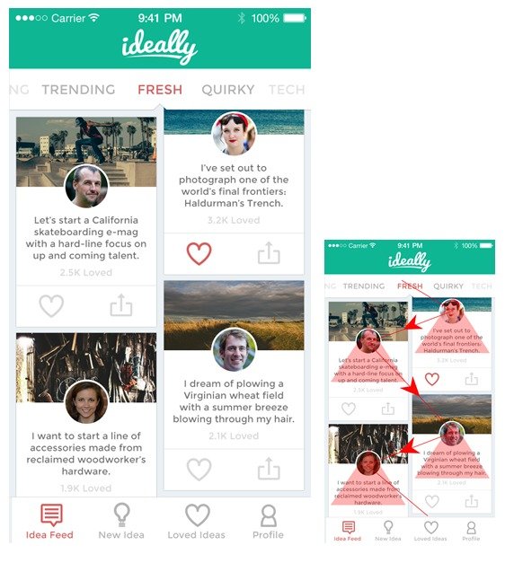 視線流動(dòng)的軌跡多則是從上至下從左到右移動(dòng),如果不能圍繞這樣的視線軌跡進(jìn)行排版,用戶在閱讀的時(shí)候會(huì)變得很吃力,找不到重點(diǎn),使用戶產(chǎn)生反感。所以在界面設(shè)計(jì)中格外需要注意這個(gè)地方。現(xiàn)在界面一般是上下滑動(dòng)的,做好視線引導(dǎo),可以大大減小用戶的負(fù)擔(dān)和閱讀疲勞。
