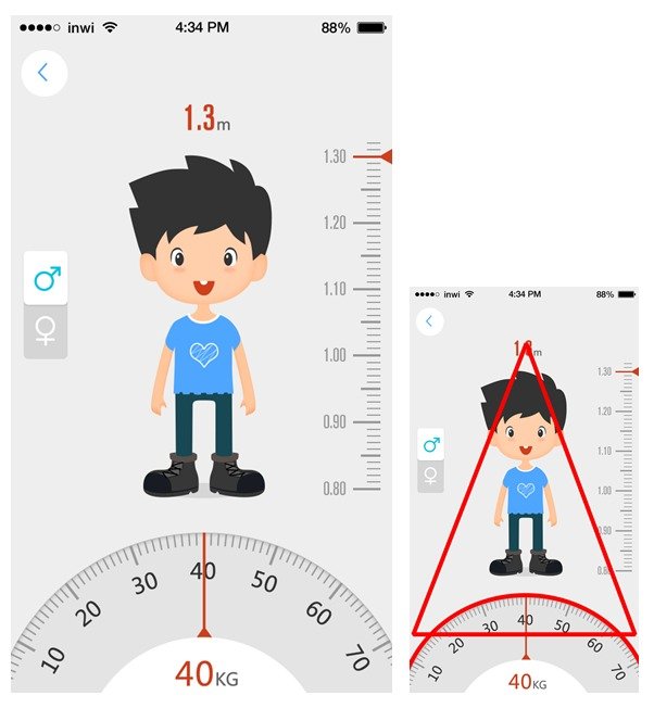當(dāng)時(shí)在設(shè)計(jì)兒童衛(wèi)士寶貝信息設(shè)置頁時(shí)運(yùn)用到了三角構(gòu)圖與圓形構(gòu)圖的結(jié)合。將體重刻度做成可滑動(dòng)操作的方式,而卡通形象來突出設(shè)置的對(duì)象及這個(gè)頁面的功能。