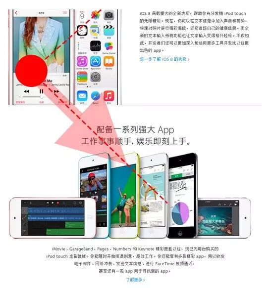 在iPod touch 的介紹中,第一張圖片展開的效果用到了三角形構(gòu)圖,強(qiáng)化了引導(dǎo)視線軌跡的指示性。同時(shí)多張圖片借助手機(jī)排列方向引導(dǎo)到視線軌跡,很好地實(shí)現(xiàn)了圖片—文字—圖片之間切換,將用戶帶入到整個(gè)產(chǎn)品畫面中。