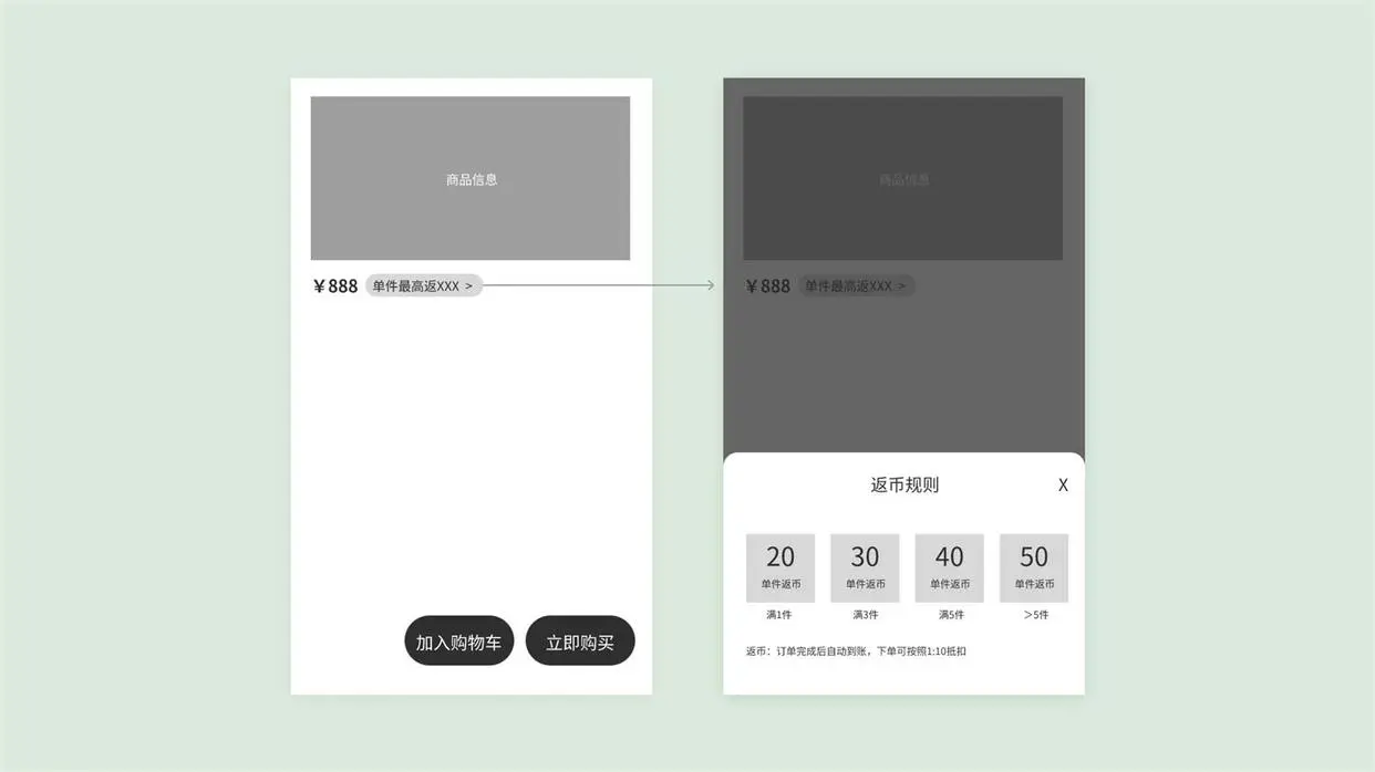 乍一看該功能都不需要設計師參與,只需要根據(jù)商品的返虛擬幣規(guī)則,將之前的單件反幣標識改成多個就行,如“1 件返 XX、3 件返 XX…”,雖然看起來好像也解決了業(yè)務訴求,但是如果僅僅考慮標識展示,而不結(jié)合需求背后的業(yè)務邏輯去思考,后續(xù)也會隨著規(guī)則的變化而帶來對應的問題,那對于交互與UI設計師而言,針對這個需求,又該如何考慮的呢?我將分為“交互篇”與“UI篇”來分別闡述。