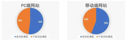 在美國一份針對 50 家頂級零售電商網(wǎng)站的統(tǒng)計中,發(fā)現(xiàn)輪播圖被廣泛運用于電商網(wǎng)站:PC 端 52%的電商網(wǎng)站使用輪播圖,而與此同時移動端 56%的電商網(wǎng)站使用輪播圖。(以下圖表是譯者個人為方便大家理解制作的)
