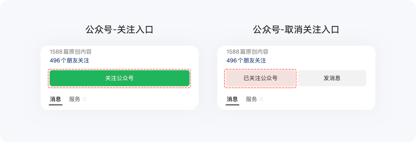 有時候,出于商業(yè)化的目的,同一個選項在二次操作時,產(chǎn)品會刻意增加用戶操作成本,以降低選擇效率,看似??硕傻姆聪虿僮鳎瑓s一定程度地降低了用戶退出率,實則對產(chǎn)品有益。例如,在關注微信公眾號之前,非常醒目的關注按鈕觸手可及,可關注之后,弱化的幽靈按鈕及文案,很難一眼看出這就是取消關注入口,需要用戶花費額外的時間去理解或試錯方可取關,這么做能降低公眾號粉絲的取關量。為公眾號留住粉絲,更是對內容認可的一種支持,后面的良性循環(huán)無需多講。