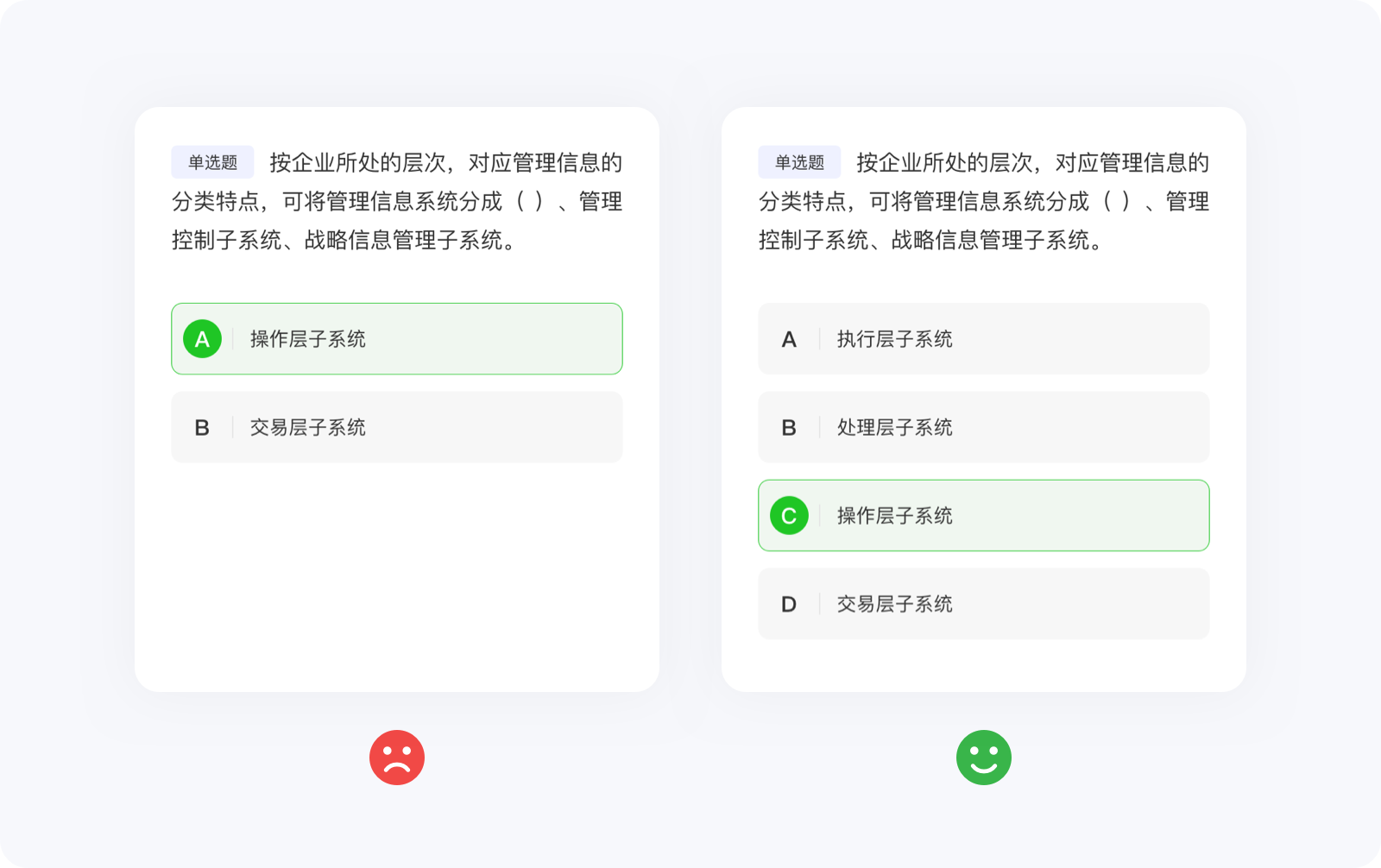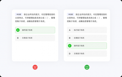 任何定律都有其自身的使用局限,所以也不要極度推崇??硕啥喕匠橄蟮牡夭?。大部分情況下,希克定律都是用在可交互界面中的元素,對于那些需要高度搜索、閱讀或學習刷題類的功能并不適用,因為設計師只能決定信息呈現(xiàn)的視覺效果,并不能決定內容的質量、類型與數(shù)量。例如,刷題類應用,面對海量的選擇題,??硕呻m然失去價值,但并不影響設計師結合其他方法論將界面設計的更好,總不能強行使用??硕桑瑢⑦x擇題刪減到只剩兩個(變成判斷題)選項吧。