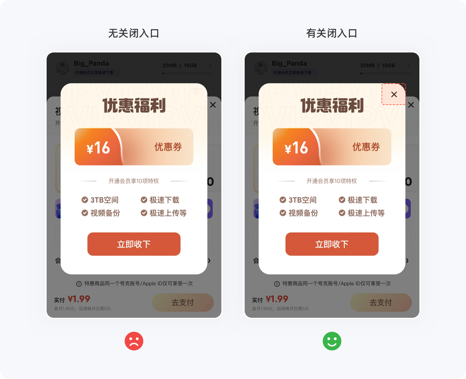 希克定律要做的是通過減少用戶做決定的時間,來提升轉化率以及用戶體驗,但不管在什么情況下,用戶都希望自己還擁有選擇的權利,如果設計師自作聰明的將選項減到只剩一個,就相當于告知用戶必須接受,那么用戶就有種被強制、綁架的感覺,只會存在兩個結果:①被你的產(chǎn)品拿捏、②離開你的產(chǎn)品,筆者相信第一種可能性的概率極低,畢竟同類型的產(chǎn)品并不是只有你一家(壟斷除外)。如下圖的彈窗,用戶即便不愿意進入任務流程,可別無選擇,只能進入后再返回才能回到原位,這種做法無端增加用戶的操作成本,極易引起反感情緒。不管產(chǎn)品如何希望用戶轉化,切不可強制他們接受,需要給用戶留一條返回的“路”,即便不那么起眼,至少還有選擇的權利。