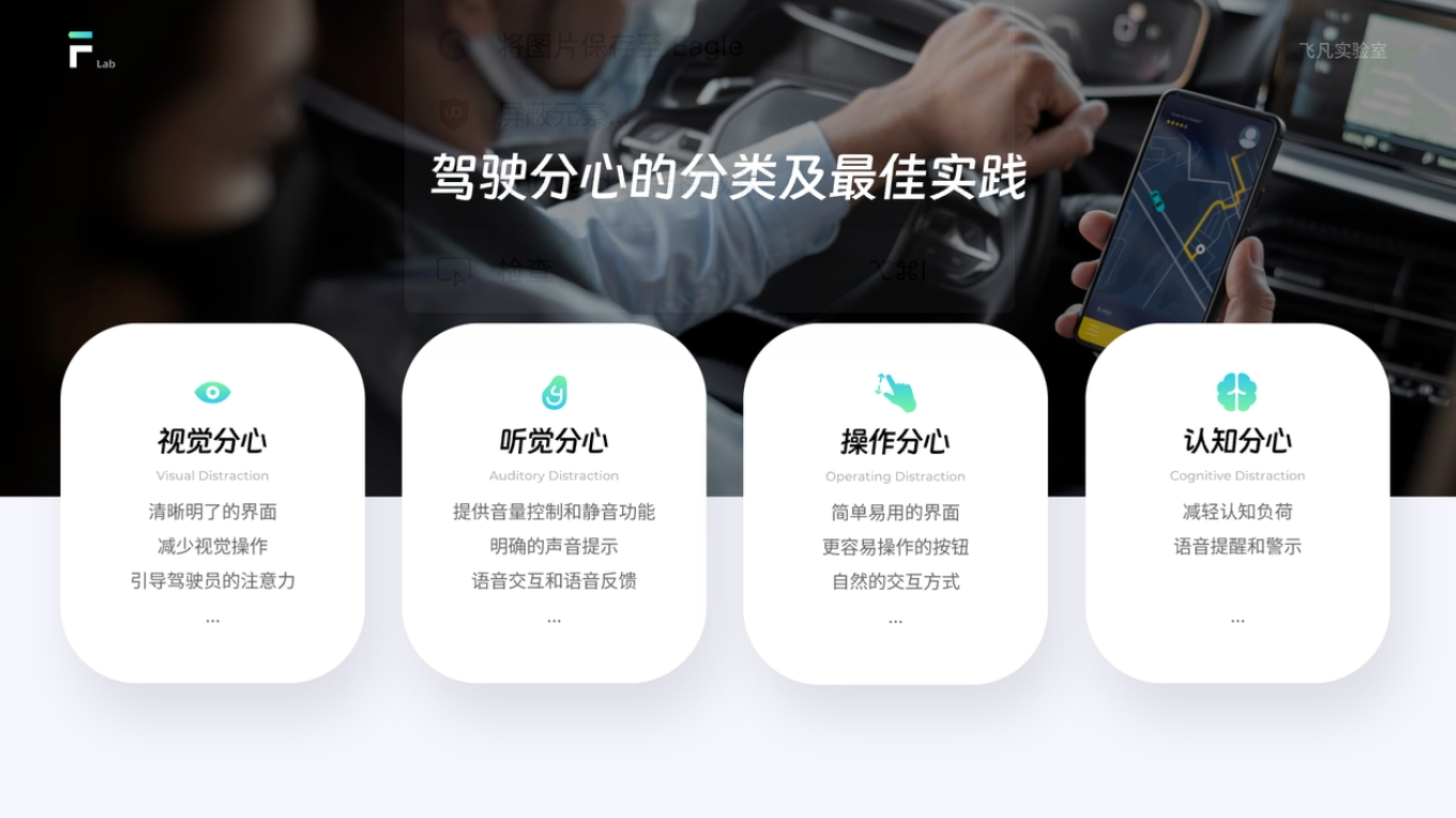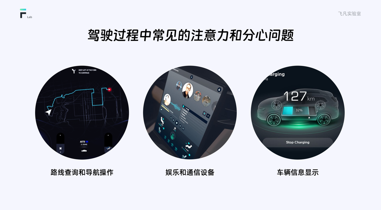 在駕駛過(guò)程中,有一些常見(jiàn)的注意力和分心問(wèn)題需要我們關(guān)注和解決。路線查詢和導(dǎo)航操作:駕駛員需要查看導(dǎo)航系統(tǒng)、調(diào)整路線和尋找目的地等操作,這可能轉(zhuǎn)移駕駛員的注意力,導(dǎo)致駕駛員對(duì)道路情況的關(guān)注度下降。娛樂(lè)和通信設(shè)備:駕駛員使用娛樂(lè)系統(tǒng)或通信設(shè)備進(jìn)行音樂(lè)播放、電話通話或信息發(fā)送等操作,這會(huì)分散駕駛員的注意力,增加駕駛風(fēng)險(xiǎn)。車輛信息顯示:車輛上的信息顯示系統(tǒng)可能包含大量的信息,如車速、油耗、車輛故障等,駕駛員需要分散注意力去獲取和理解這些信息,這可能影響駕駛員對(duì)道路情況的感知和對(duì)緊急情況的反應(yīng)能力。了解駕駛員的注意力和分心因素對(duì)于優(yōu)化車載界面設(shè)計(jì)至關(guān)重要。那么我們?nèi)绾螏椭{駛員保持集中注意力,并減少分心情況的發(fā)生。
