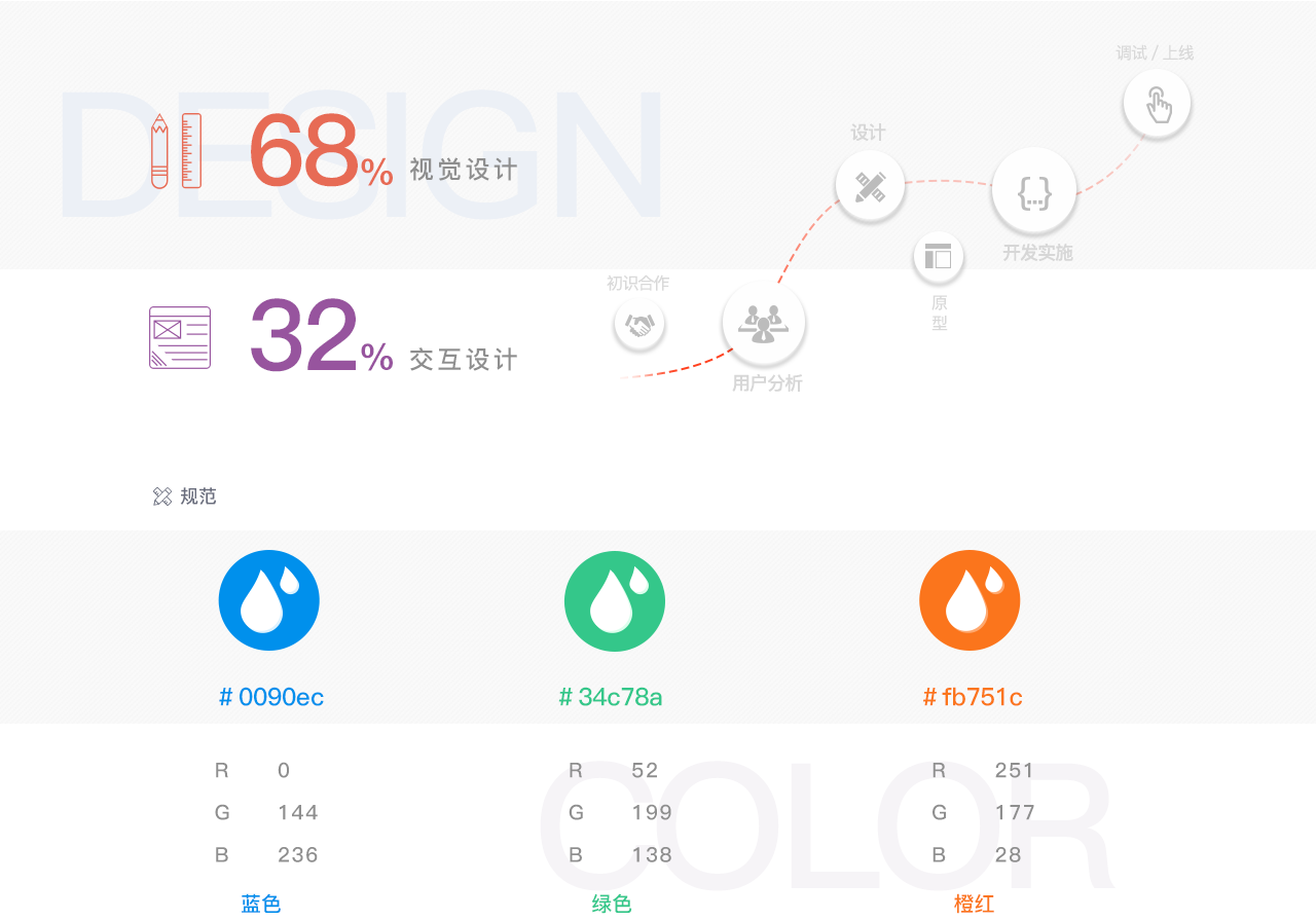 整體顏色以深藍(lán)色為底搭配藍(lán)、綠、橙紅、紅等亮色使用這樣的顏色組合,藍(lán)色為水的顏色同時(shí)為自來水集團(tuán)Vl標(biāo)準(zhǔn)色配合綠黃使用相互互補(bǔ),同時(shí)藍(lán)綠與橙綠分別是相鄰色而黃色與藍(lán)色又互為互補(bǔ)色,能在設(shè)計(jì)中起到關(guān)鍵信息點(diǎn)、事件強(qiáng)烈對(duì)比作用,以吸引用戶的注意