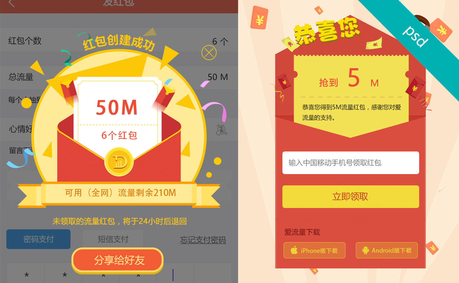 手機(jī)APP發(fā)紅包及搶紅包兩頁psd